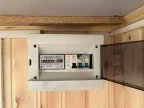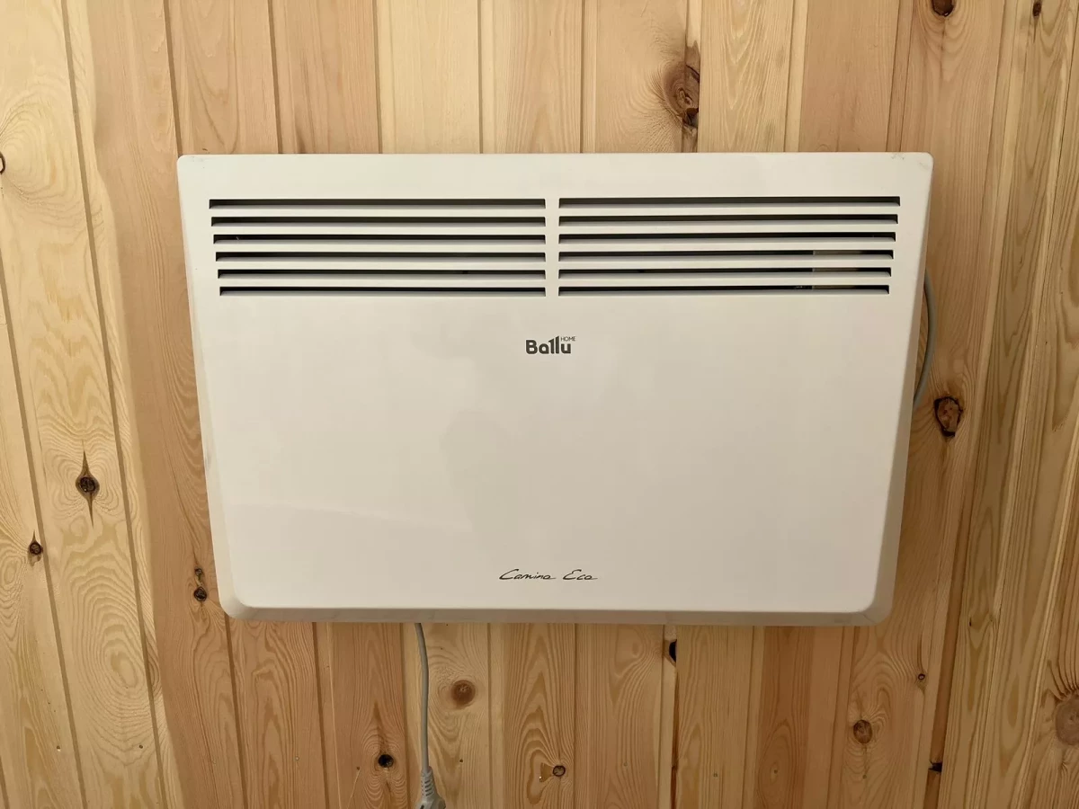 Электрика«стандарт» два светильника в комнате, блок розеток, выключатель, электросчетчик, проводка в коробах ПВХ, электрический конвектор (обогреватель), металлический ввод электропроводки «гусак»